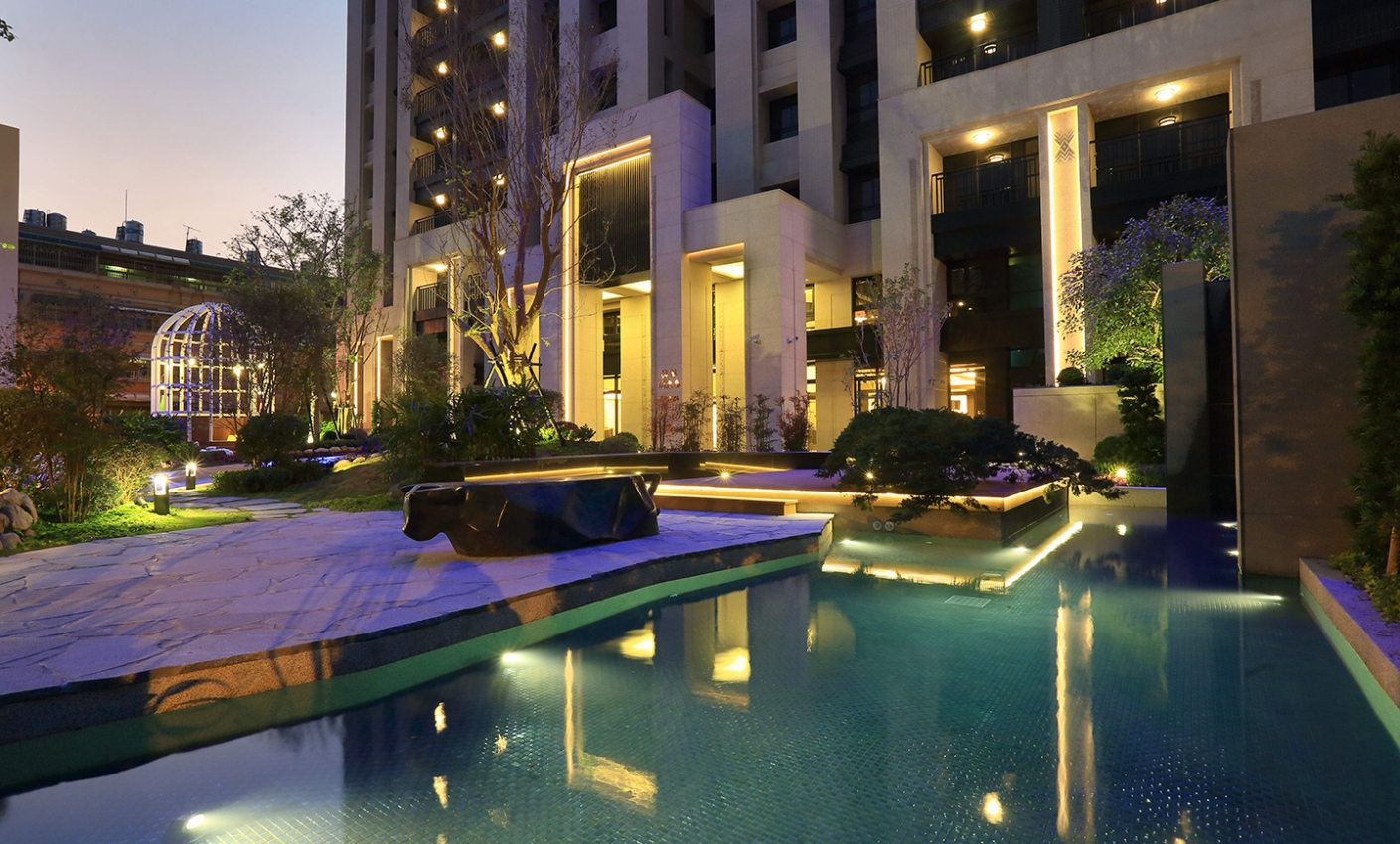 以多元生活機能與現代建築語彙為特色,本案燈光設計著重於形塑明亮、安全且富質感的社區夜間氛圍。透過入口端景、建築立面、步道與景觀節點的光線配置,強調動線引導與空間層次,讓社區於夜晚仍展現獨特節奏與美感。